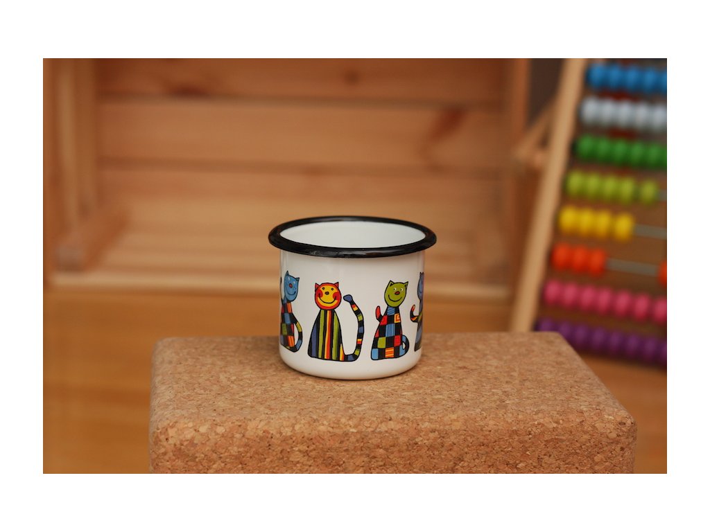 Originální smaltovaný hrnek - bílý plecháček s motivem veselých koček je vhodný jako originální dárek pro všechny milovníky kočiček. Smaltovaný plecháček je skvělým společníkem i na dobrodružné cyklistické výpravy do hor i na vodu, pod stan i na tábor.