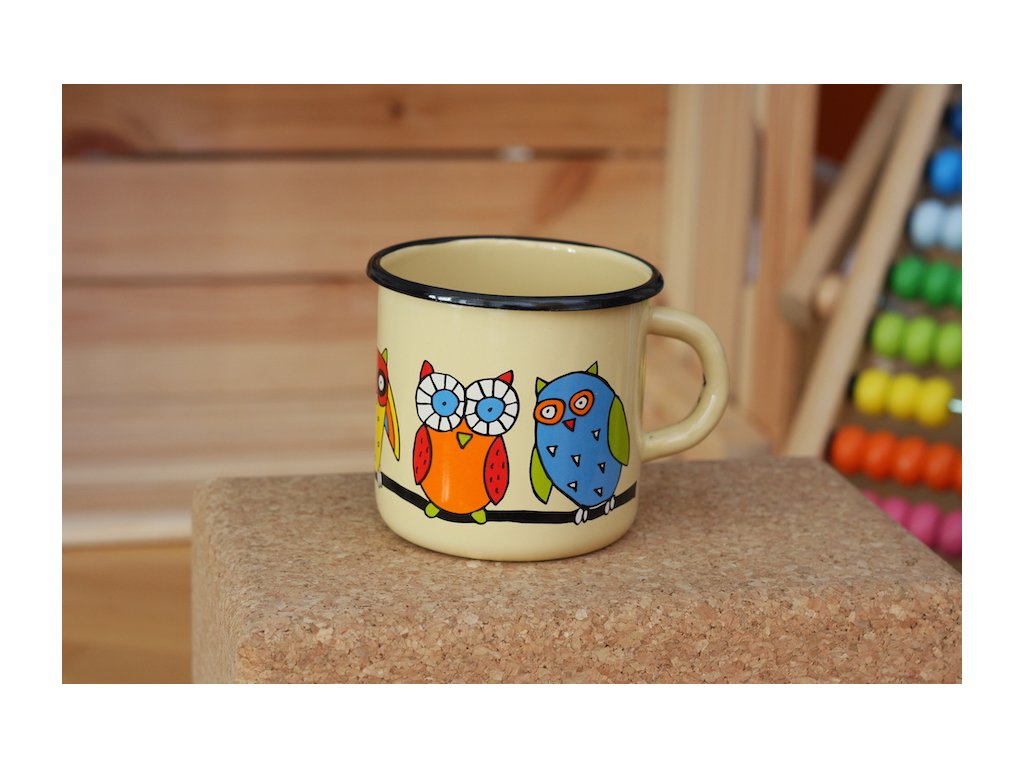 Originální smaltovaný hrnek - krémový plecháček s motivem soviček je vhodný jako originální dárek pro všechny moudré kamarády a kolegy.. Smaltovaný plecháček je skvělým společníkem i na dobrodružné cyklistické výpravy do hor i na vodu, pod stan i na tábor.