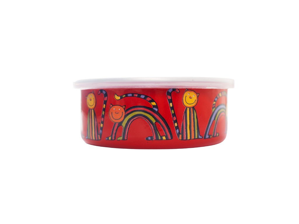 Smaltovaná miska s víkem červená motiv kočka